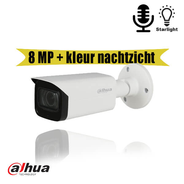 In tegenstelling tot onze 8MP dome camera hebben wij ook de bullet 4K HDCVI van Dahua. Deze krachtige bullet kleuren nachtzicht camera heeft alles aan boord voor de moderne hoge resolutie videobewaking van vandaag de dag. Behalve dat het mogelijk is dmv Starlight kleuren nacht opnames te maken, heeft hij ook audio aan boord. Bovendien kan hij, als er 100% duisternis is, zijn IR inschakelen zodat u maar liefst 100 meter helder nachtzicht heeft.