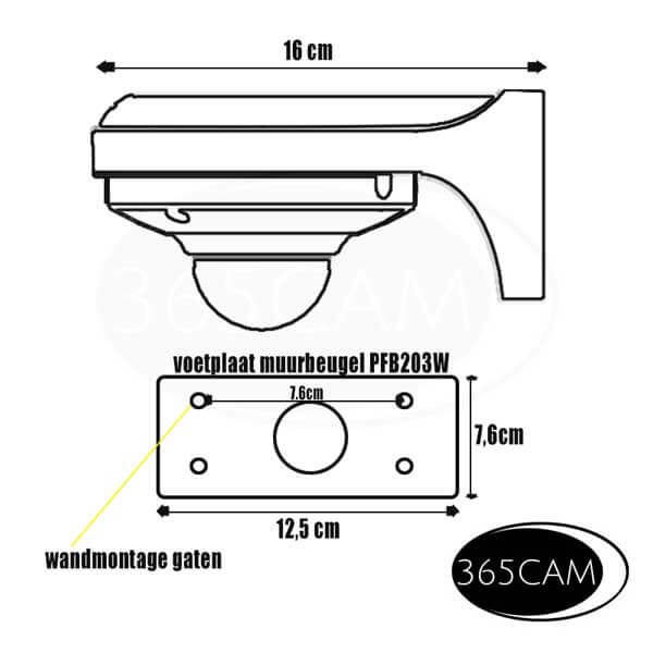 Deze muurbeugel wordt geleverd met pluggen en rvs schroeven. (Zowel voor de muur alsvoor de camera) De muurbeugel is van aluminium en de afmetingen zijn: (B x D x H) 168mm x 127mm x 80mm. Gewicht is 570 gram.