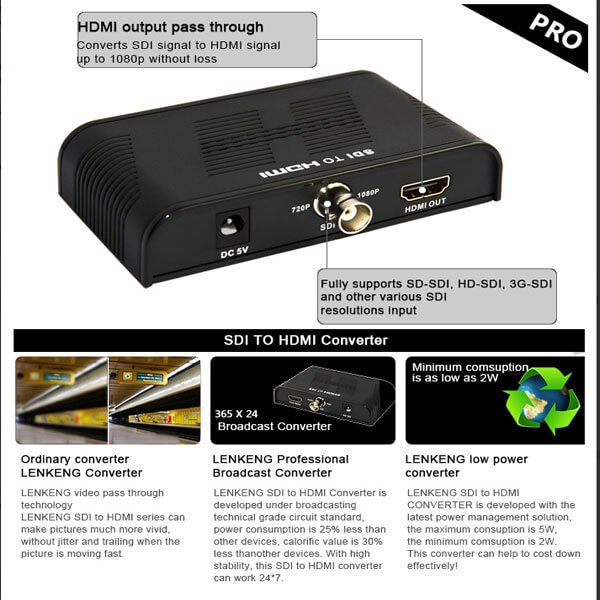 LKV368 SDI to HDMI Converter converts SD-SDI,HD-SDI,and 3G-SDI signal to HDMI and ensure high bit rates of 2.97Gb/s to give users fast signal transmission without any loss.